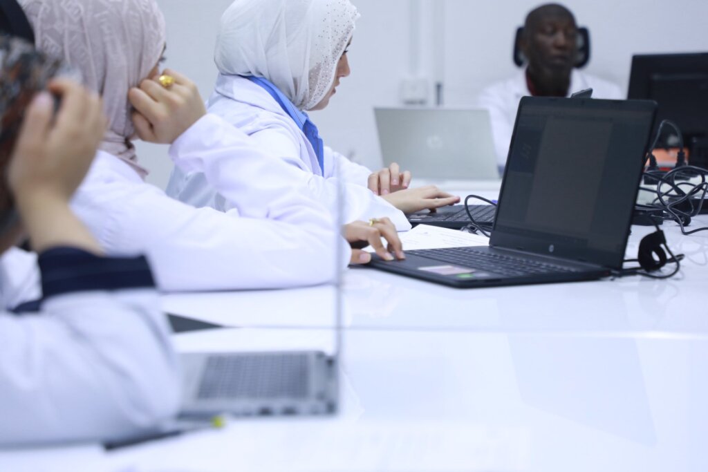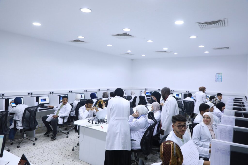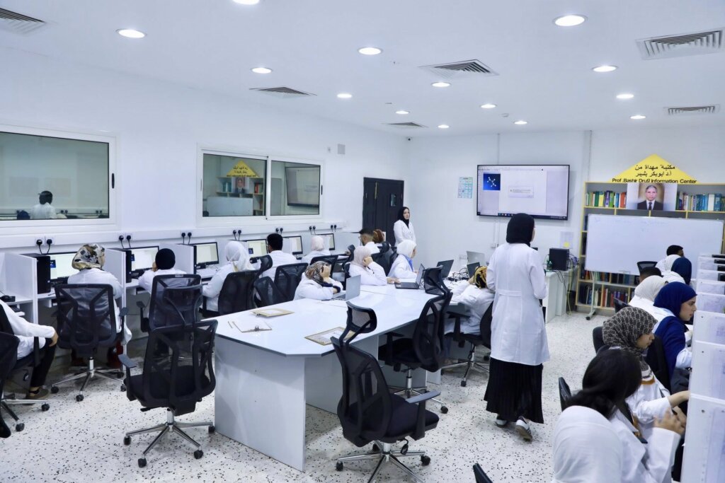أجرى طلاب السنة الأولى من برنامج دكتور صيدلة (PharmD)،أمس الأربعاء الموافق 8 أكتوبر 2025، تدريباتهم التطبيقية في معمل المحاكاة (Simulation Lab). تركَّزت التدريبات على مادة الكيمياء العضوية، حيث قام الطلاب بمراقبة وفحص التغيرات في التكوينات الجزيئية لمركبات الألكانات والألكينات (Alkanes & Alkenes)، وذلك في إطار تعميق فهمهم للمفاهيم النظرية من خلال التطبيق العملي ، بحضور عضو هيئة التدريس والمشرفين التعليميين .